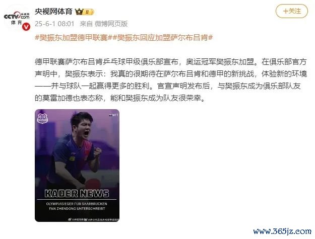 据央视网体育6月1日消息惠红网,德甲联赛萨尔布吕肯乒乓球甲级俱乐部宣布,奥运冠军樊振东加盟。