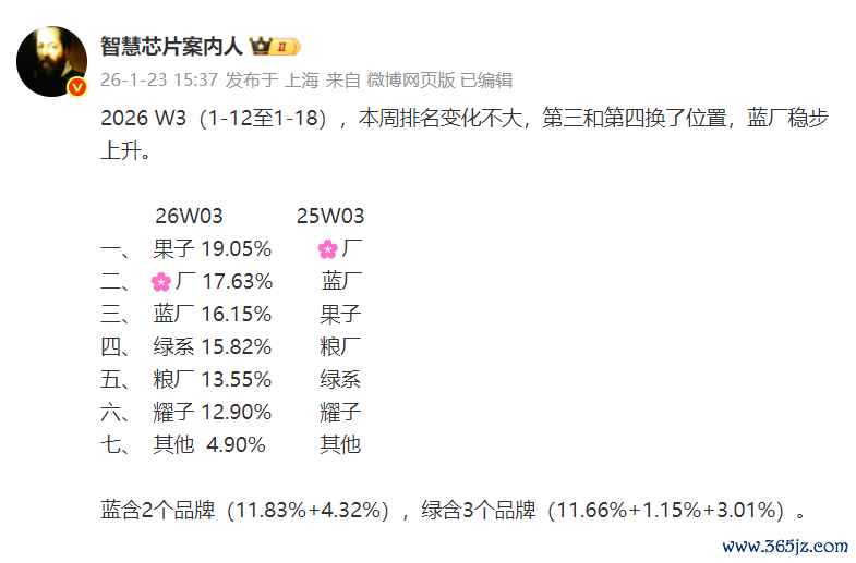 这不行业人士“智慧芯片案内人”就在1月23日提供了2026年国内W3周的销量数据,他表示本周变化不大,第三和第四换了位置,vivo稳步上升。苹果以19.06%的份额继续排名第一位,同比提升了两位。以17.63%的份额持续排名第二位,同比是下降了一位。vivo以16.15%的份额排名第三位,同比是下降一位,环比是增长一位。OPPO以15.82%的份额排名第四位,同比是提升一位,环比是下降一位。小米以13.55%的份额排名第五位,同比下降一位;荣耀以12.90%的份额排名第六位,同比与环比都是没有变化的。