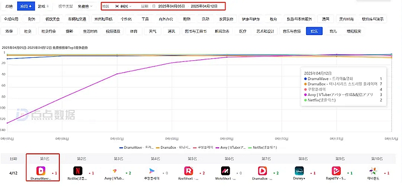 另据第三方数据显示,截至2025年3月,DramaWave月活跃用户量已突破1000万大关,用户规模成功跻身行业前五,稳居出海短剧赛道第一梯队。平台旗下爆款短剧《订婚风暴》表现强劲,上线仅5天播放量便突破千万大关。在该剧的推动下,DramaWave自4月5日起成功跻身韩国Google Play娱乐应用榜TOP 10亿米网,并持续逼近长期占据领先地位的Netflix。随后,其市场表现进一步攀升,于4月12日登顶该榜单榜首,并连续霸榜四天,实现在韩国市场对Netflix的超越。